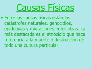 Este documento describe varias causas por las cuales las lenguas pueden llegar a extinguirse. Las causas físicas incluyen catástrofes naturales, genocidios y epidemias que pueden dar lugar a la desaparición total de los hablantes de una lengua. Las causas políticas comprenden la opresión de lenguas minoritarias por parte de estados centralizados. Las causas económico-sociales implican la presión de economías dominantes y la creación de clases sociales superiores que adoptan otras lenguas.