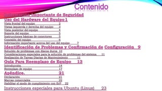 Este documento contiene información sobre la seguridad y el funcionamiento de un equipo electrónico. Incluye instrucciones para el uso seguro del producto y advertencias sobre posibles riesgos. También describe brevemente los componentes del equipo y cómo conectarlos, así como consejos para la solución de problemas y el mantenimiento básico.