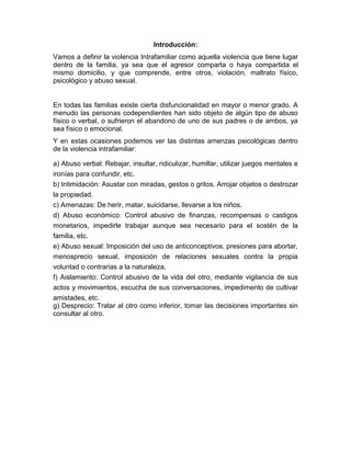 Este documento describe la violencia intrafamiliar y sus efectos dañinos en los niños. Define la violencia doméstica como un patrón de comportamiento coercitivo y abusivo que puede incluir abuso físico, psicológico, sexual o aislamiento. Explica que la violencia sigue un ciclo de tensión creciente, episodio agudo de violencia y luego arrepentimiento temporal. El abuso verbal y emocional durante la niñez puede causar daños profundos en la autoestima y las futuras relaciones de la víctima.