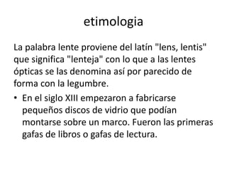 Las lentes son objetos transparentes con superficies curvas que refractan la luz. Se usan para corregir la visión y en instrumentos ópticos como microscopios y telescopios. Están hechas de vidrio óptico y se fabrican moldeando, puliendo y rectificando las superficies curvas para lograr la forma deseada. Las lentes convergentes forman imágenes reales e invertidas, mientras que las lentes divergentes forman imágenes virtuales y derechas.