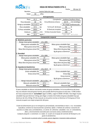 Este documento presenta los resultados de una evaluación de composición corporal de una mujer de 44 años. Su peso actual es de 61.3 kg y su índice de masa corporal está dentro del rango saludable. Para alcanzar su peso saludable de 57.5 kg y niveles intermedios de grasa corporal saludable, necesita perder entre 3.8 y 4.8 kg. Su porcentaje de músculo se encuentra dentro del rango normal y se mantendrá o aumentará al bajar su porcentaje de grasa. Se le proporcionará un plan de alimentación personal