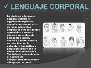 El documento define varios términos relacionados con la comunicación no verbal, incluyendo la audiencia, la kinésica o lenguaje corporal, los gestos, y el lugar. Explica que la audiencia se refiere al público que recibe mensajes a través de los medios de comunicación o a un tribunal judicial. Define la kinésica como el estudio del significado de los movimientos y gestos no verbales. Describe los gestos como formas de comunicación no verbal realizadas con el cuerpo. Y explica que el lugar se refiere a una aglomeración
