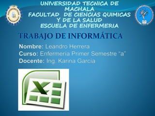 El documento contiene información sobre un estudiante de enfermería llamado Leandro Herrera que está cursando el primer semestre de la sección "a". El docente a cargo es la Ing. Karina García.