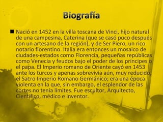 Leonardo da Vinci nació en 1452 en Italia. Fue pintor, escultor, ingeniero, arquitecto y científico del Renacimiento, considerado uno de los mayores genios de todos los tiempos. Creó obras maestras como La última cena y La Virgen de las Rocas, perfeccionando técnicas como el claroscuro y sfumato. Además de pintar, se dedicó a proyectos de arquitectura, escultura e investigación científica. A pesar de que muchas de sus obras no se completaron, su