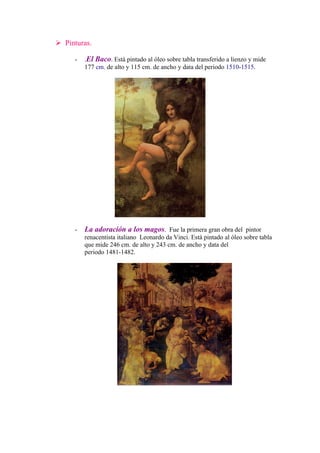 Leonardo da Vinci nació en 1452 en Italia. Fue pintor, científico, inventor, arquitecto y estudió anatomía humana. Algunas de sus obras más famosas incluyen La Gioconda, La última cena y estudios sobre el vuelo de pájaros. Exploró muchas áreas como la ingeniería, la medicina y las matemáticas a través de la observación detallada de la naturaleza.