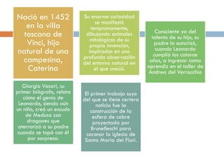 Leonardo da Vinci nació en 1452 en Italia y demostró una gran curiosidad e ingenio desde una edad temprana. Se convirtió en aprendiz de un famoso pintor y desarrolló habilidades en varias áreas incluyendo pintura, ciencia e ingeniería. Su legado ha sido muy influyente a pesar de que sus contemporáneos no apreciaron completamente el alcance de sus logros científicos.