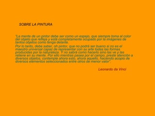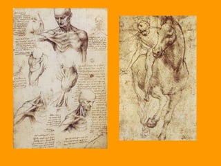 El documento describe la vida y obras de Leonardo da Vinci, uno de los artistas más grandes del Renacimiento. Nació en 1452 en Italia y destacó como pintor, escultor, arquitecto, ingeniero y científico. Sus pinturas más famosas incluyen La Gioconda y La última cena. Da Vinci también realizó importantes estudios científicos y desarrolló nuevas técnicas pictóricas como el esfumado. Fue un pionero que fusionó el arte y la ciencia.