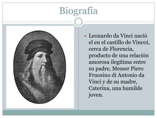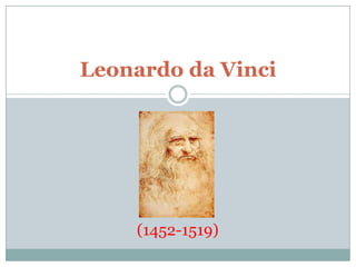Leonardo da Vinci nació en 1452 en Italia de padres no casados. Demostró talento artístico desde una edad temprana y estudió con pintores renacentistas. Creó obras maestras como La última cena, La Mona Lisa y paisajes del valle de Arno. Murió en 1519 dejando atrás miles de documentos con sus ideas sobre arte, ciencia e ingeniería.