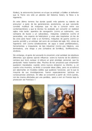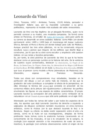 Leonardo da Vinci fue un polifacético artista, científico e investigador renacentista italiano conocido principalmente por sus pinturas como La Mona Lisa y La Última Cena. Además de destacar como pintor, Leonardo realizó importantes estudios e inventos en campos como la anatomía, la ingeniería y la aeronáutica que anticiparon descubrimientos modernos. Sin embargo, su curiosidad insaciable lo llevó a emprender demasiados proyectos sin terminar ninguno, por lo que tuvo poca influencia práctica a pes