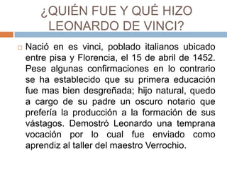 Leonardo da Vinci nació en 1452 en Vinci, Italia. Demostró un gran talento artístico desde temprana edad y se formó en el taller de Verrocchio en Florencia. Produjo obras maestras como La última cena y La Virgen de las Rocas durante su estancia en la corte de Ludovico Sforza en Milán. En sus últimos años viajó por Italia y Francia, donde murió en 1519 bajo el patrocinio del rey Francisco I.
