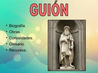 Leonardo da Vinci nació en 1452 en Italia. Pasó su infancia manifestando un gran talento artístico y se convirtió en aprendiz de Andrea del Verrochio. Durante su juventud trabajó en Milán y fue acusado de homosexualidad. En su madurez destacó en disciplinas como la pintura, la ingeniería y la anatomía. En sus últimos años vivió en Francia, donde murió en 1519 a la edad de 67 años.