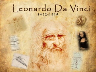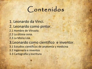 Leonardo da Vinci fue un polifacético artista e inventor italiano del Renacimiento. Famoso por sus pinturas como La última cena y La Mona Lisa, también realizó estudios científicos de anatomía y diseñó numerosas invenciones adelantadas a su tiempo como el helicóptero y el tanque de guerra. Además de pintor y científico, Leonardo destacó como ingeniero, arquitecto y cartógrafo, dejando atrás una amplia obra y legado que demuestran su genio polifacético