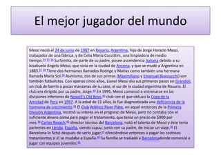 Leo Messi comenzó a jugar al fútbol a una edad joven en Argentina y su potencial fue rápidamente identificado por el Barcelona. Se trasladó a España a los 13 años junto con su familia, donde el Barcelona pagó sus gastos médicos. Se convirtió en el jugador más joven en debutar con el primer equipo del Barcelona y ha ganado múltiples títulos con el club. Messi también ha tenido éxito con la selección argentina, ayudando al equipo a llegar a la final de la Copa América en 2007.