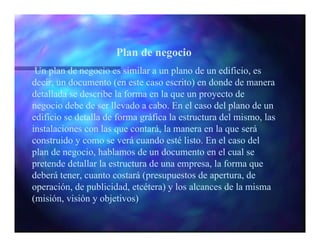 Este documento describe los elementos clave de un plan de negocios para una micro, pequeña o mediana empresa. Explica que un plan de negocios detalla la estructura, costos y objetivos de una empresa de manera similar a como un plano arquitectónico describe un edificio. Luego enumera los elementos comunes que componen un plan de negocios como la planeación del negocio, la comercialización, las operaciones y un resumen ejecutivo.