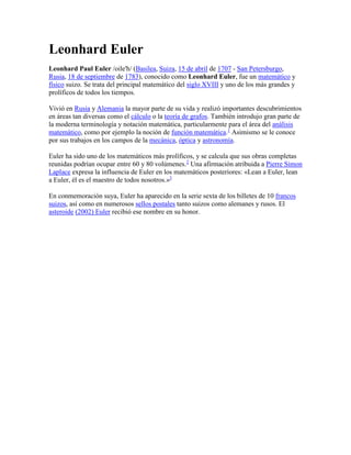 Leonhard Euler fue un destacado matemático y físico suizo del siglo XVIII, considerado uno de los más grandes de la historia. Vivió principalmente en Rusia y Alemania, donde realizó importantes contribuciones al cálculo, la teoría de grafos y campos como la mecánica, óptica y astronomía. Fue uno de los matemáticos más prolíficos, calculándose que sus obras completas podrían ocupar entre 60 y 80 volúmenes. Se le atribuye haber introducido gran parte de la moderna