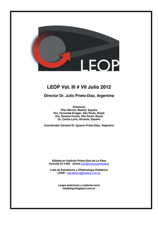 Este documento presenta un resumen de la Leop Vol. III # VII de julio de 2012. Incluye la dirección, el directorio y la información de contacto. También presenta dos casos clínicos enviados por colegas para ser comentados, junto con comentarios sobre casos presentados en Leops anteriores. Finalmente, invita a los miembros a enviar nuevos casos para ser discutidos en la próxima edición.