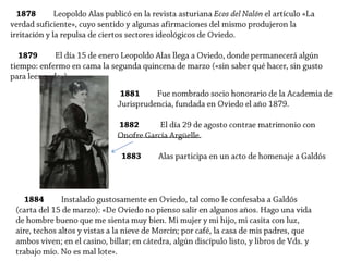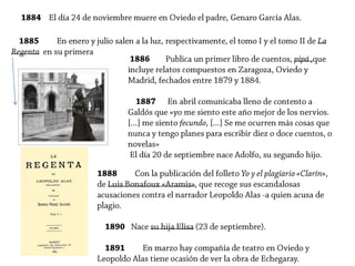Leopoldo Alas Clarín fue un escritor español del siglo XIX conocido por sus obras realistas y naturalistas que utilizaban innovadoras técnicas narrativas como el discurso indirecto libre y el monólogo interior. Escribió varias novelas cortas, novelas y obras de teatro que criticaban a la iglesia y promovían las ideas liberales. Se le recuerda especialmente por sus novelas La Regenta y Su único hijo.