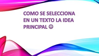 El documento explica cómo identificar la idea principal de un texto. Indica que la idea principal transmite el mensaje más importante que el autor quiere comunicar sobre el tema. Puede aparecer al inicio, medio o final del párrafo e incluso ser implícita. Propone tres pasos: 1) identificar detalles relevantes, 2) identificar ideas importantes en cada párrafo, 3) determinar la idea principal del texto. Luego aplica estos pasos a un ejemplo para identificar su idea principal.
