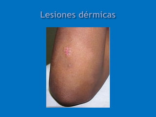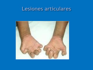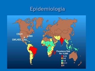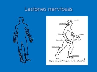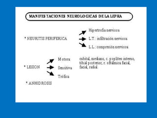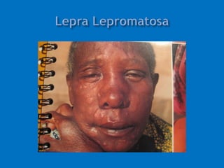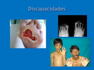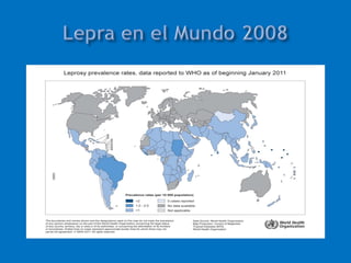 El documento resume la historia, causas, síntomas y tratamiento de la lepra. La OMS buscó eliminar la lepra como problema de salud pública en el 2000 mediante la curación de 14 millones de enfermos en 20 años. Aunque la morbilidad ha disminuido significativamente, todavía se reportan cientos de miles de nuevos casos cada año, principalmente en India, Brasil e Indonesia. El tratamiento es gratuito y se basa en una combinación de medicamentos durante periodos de 6 meses a 2 años dependiendo de la gravedad del caso.