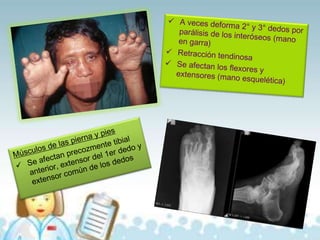 El documento resume la historia y epidemiología de la lepra. Comenzó expandiéndose en el Mediterráneo hace miles de años y se propagó a América a través del comercio de esclavos. Actualmente sigue siendo endémica en algunas regiones de África y Asia. En México, la mayoría de los casos se concentran en 5 estados y la Secretaría de Salud está trabajando para erradicarla a través de clínicas y tratamiento.