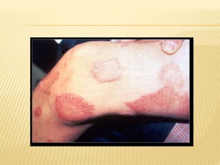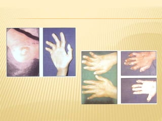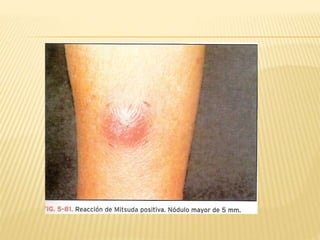 Este documento proporciona información sobre la lepra o enfermedad de Hansen. Describe que la lepra es causada por la bacteria Mycobacterium leprae y explica los diferentes tipos de lepra (lepromatosa, tuberculoide, dimorfa e indeterminada) según parámetros clínicos, baciloscópicos, inmunológicos e histopatológicos. También describe las manifestaciones cutáneas, neurológicas y sistémicas de la enfermedad, así como los métodos de diagnóstico como bac