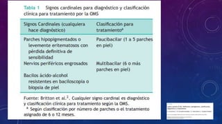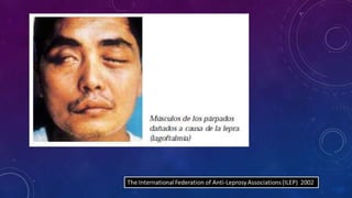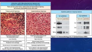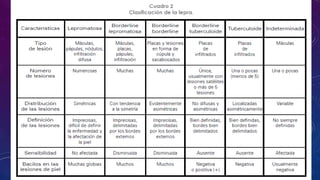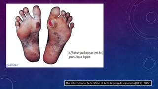 Este documento trata sobre la lepra. Explica que la lepra es una infección crónica causada por Mycobacterium leprae que afecta principalmente la piel y los nervios periféricos. Describe las dos formas principales de lepra (tuberculoide y lepromatosa) y sus características clínicas, patológicas y de respuesta inmune. También resume los esfuerzos históricos para controlar la lepra y las pruebas disponibles para su diagnóstico.