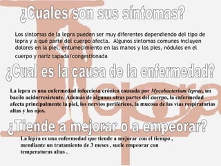 La lepra es causada por la bacteria Mycobacterium leprae y afecta principalmente la piel, nervios y mucosas. Sus síntomas incluyen dolor y entumecimiento en la piel, nódulos y congestión nasal. Aunque tiende a mejorar con tratamiento de antibióticos como la dapsona, puede empeorar con fiebre alta. Aún afecta a millones en todo el mundo, especialmente en la India, y se transmite principalmente a través del contacto directo con personas infectadas.