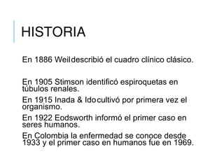 Este documento describe la leptospirosis, una enfermedad zoonótica causada por bacterias del género Leptospira. Se transmite principalmente a través del contacto con la orina de animales infectados. La leptospirosis puede presentarse de forma anicterica o ictérica (enfermedad de Weil) y afecta diversos órganos como el hígado, los riñones y los músculos. El diagnóstico se realiza mediante pruebas serológicas o de cultivo y el tratamiento incluye