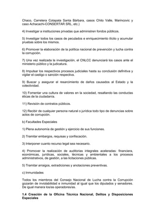 La Ley de Marcelo Quiroga Santa Cruz contra la Corrupción establece un Consejo Nacional contra la Corrupción independiente de los tres poderes del Estado para investigar, prevenir y sancionar actos de corrupción. Se crea una Oficina Técnica Nacional contra la Corrupción con recursos para investigar delitos como enriquecimiento ilícito, sobornos, tráfico de influencias y otros. Además, la ley promueve la transparencia en la gestión pública garantizando el acceso a la información generada por entidades públicas.