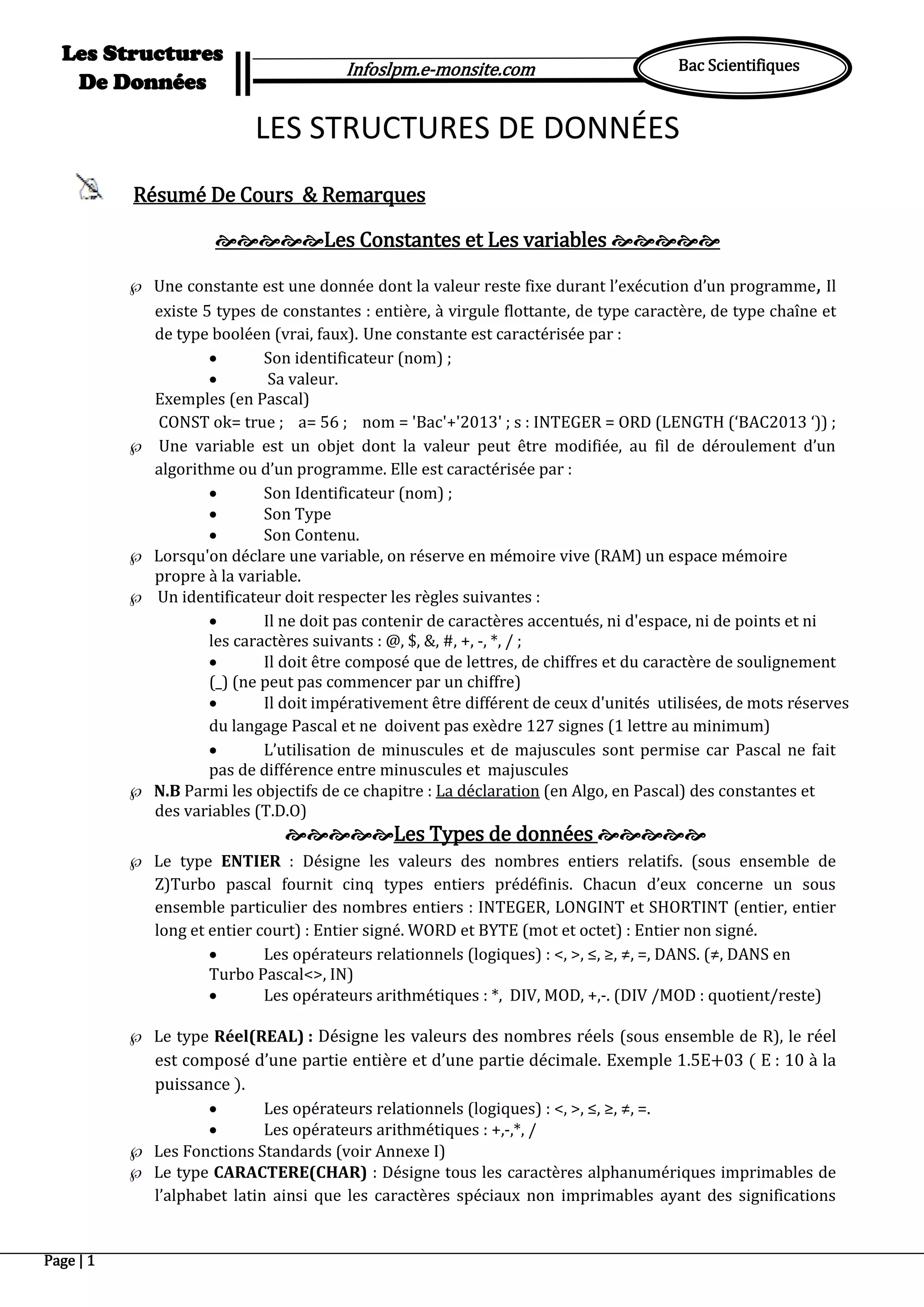 Le document présente les concepts fondamentaux des structures de données en programmation, en mettant l'accent sur les constantes, les variables et leurs types. Il détaille également les opérations sur ces structures, incluant des exemples en Pascal, ainsi que le fonctionnement des tableaux et des types utilisateurs. Enfin, le texte aborde les attributs des expressions arithmétiques et logiques, les instructions d'entrée/sortie, et les règles de syntaxe pour la déclaration et l'affectation.