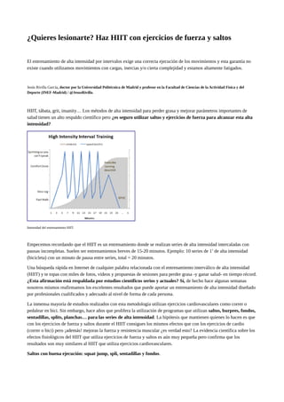 El entrenamiento de alta intensidad por intervalos (HIIT) es efectivo, pero su ejecución debe ser cuidadosa, especialmente al introducir ejercicios de fuerza y saltos, ya que estos pueden ser lesivos bajo fatiga. La evidencia sugiere que los HIIT que utilizan cardio son más seguros que aquellos que incorporan movimientos complejos, especialmente para personas con menor condición física. Se recomienda evitar ejercicios complejos y priorizar aquellos que sean sencillos y bien automatizados para garantizar una correcta ejecución y prevenir lesiones.