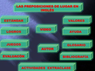 Este documento presenta información sobre las preposiciones de lugar en inglés. Explica que las preposiciones son importantes para determinar la ubicación de elementos en un lugar. Incluye ejemplos de preposiciones comunes como "on", "under", "between", "in front of", y actividades interactivas para practicar el uso de las preposiciones.