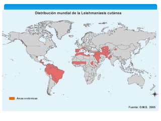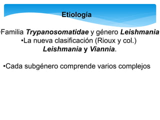 Este documento describe la leishmaniasis, una enfermedad parasitaria causada por protozoos del género Leishmania. Se clasifican las especies de Leishmania en subgéneros y complejos. Las manifestaciones clínicas incluyen kala azar, leishmaniasis cutánea y mucocutánea. Los vectores son mosquitos del género Phlebotomus y Lutzomya. El diagnóstico se realiza mediante exámenes directos, biopsias, pruebas serológicas y PCR. Los tratamientos
