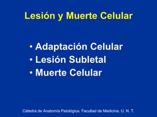 El documento trata sobre lesiones y muerte celular. Explica los conceptos de adaptación celular, lesión subletal, necrosis y apoptosis. Describe las causas de lesión celular y la respuesta de estrés celular. Explica los mecanismos moleculares de lesión celular y los cambios morfológicos en la necrosis. También describe diferentes tipos de necrosis como coagulativa, colicuativa, caseosa, gomosa, hemorrágica, grasa y fibrinoide.