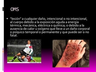 El documento define las lesiones y tipos de calificación jurídica de lesiones según diferentes fuentes como la OMS, códigos penales y autores. Describe lesiones mortales y no mortales, y tipos de lesiones simples, agravadas y calificadas, especificando las penas correspondientes según la gravedad y resultado de acuerdo al código penal de Baja California.