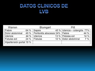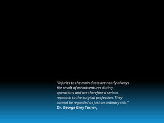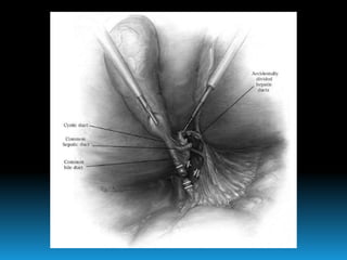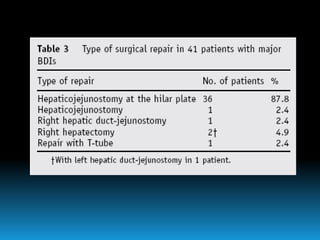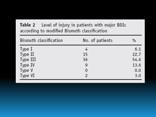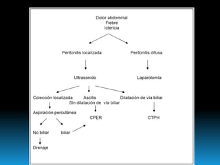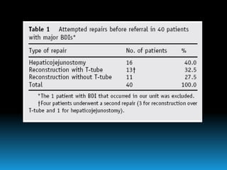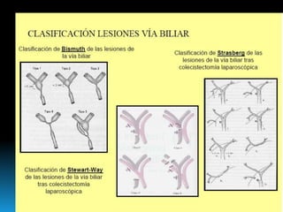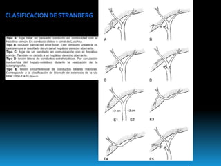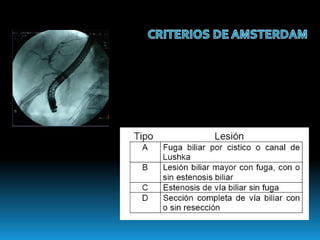 El documento describe los beneficios de un enfoque multidisciplinario para el tratamiento de lesiones de los conductos biliares que ocurren durante la colecistectomía. 66 pacientes fueron tratados por cirujanos, radiólogos y endoscopistas. La reparación quirúrgica tuvo éxito en el 78% de los casos, mientras que el drenaje biliar solo tuvo éxito en el 73.9% de los casos. Un enfoque multidisciplinario es crucial en todas las etapas del tratamiento de estas lesiones.