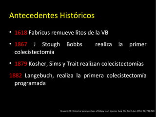 Este documento resume la historia de las lesiones benignas de la vía biliar y proporciona detalles sobre su epidemiología, clasificación, presentación clínica, diagnóstico y tratamiento. Describe los primeros procedimientos quirúrgicos realizados en la vía biliar y los factores de riesgo asociados con lesiones. Además, explica las diferentes clasificaciones utilizadas para categorizar las lesiones biliares y los enfoques quirúrgicos para su reparación.