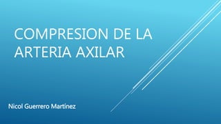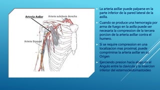 Este documento describe la anatomía y lesiones de la arteria y vena axilar. Explica cómo comprimir la arteria axilar en diferentes puntos para detener hemorragias, y cómo los aneurismas en la arteria axilar pueden causar dolor y adormecimiento. También señala que las heridas en la axila a menudo afectan a la vena axilar debido a su tamaño y posición.
