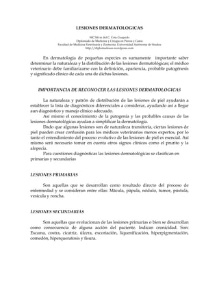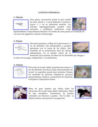 Este documento describe las lesiones dermatológicas primarias y secundarias más comunes en perros y gatos, incluyendo máculas, pápulas, nódulos, tumores, pústulas, vesículas, ronchas, escamas, costras, cicatrices, úlceras, excoriaciones, liquenificación, hiperpigmentación, comedones, hiperqueratosis y fisuras. También discute la importancia de reconocer las lesiones dermatológicas para establecer un diagnóstico a