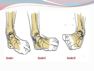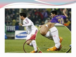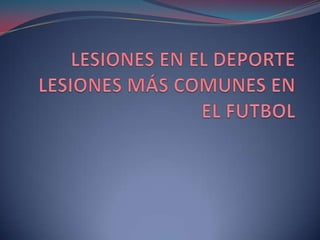 Este documento describe los principales tipos de lesiones que pueden ocurrir al practicar fútbol, incluyendo esguinces, torceduras, fracturas y lesiones de rodilla y cabeza. Ofrece recomendaciones para prevenir estas lesiones a través de un buen calentamiento, estiramiento, uso de equipo protector, y manteniendo las canchas en buenas condiciones.