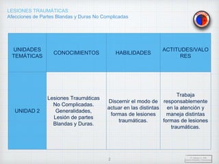 El documento presenta información sobre lesiones traumáticas no complicadas de partes blandas y duras. Explica conceptos como contusiones, esguinces, luxaciones, heridas y fracturas, describiendo sus características y formas de clasificación. El objetivo es que los estudiantes adquieran conocimientos sobre el tratamiento de diferentes tipos de lesiones traumáticas.