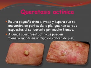 La queratosis actínica es una lesión precancerosa de la piel causada por exposición prolongada al sol. Puede transformarse en carcinoma escamocelular. El arsénico también puede causar queratosis precancerosas. La enfermedad de Bowen es un carcinoma in situ que afecta la epidermis y puede ser causado por queratosis actínicas o arsénico. La queilitis actínica es una forma agresiva de queratosis actínica que afecta el labio inferior. La leucoplasia es una lesión precancerosa de la boca