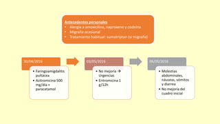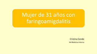 Una mujer de 31 años fue ingresada por faringoamigdalitis pultácea que no mejoró con tratamiento ambulatorio. Presentaba también molestias abdominales, náuseas, vómitos y diarrea. Las pruebas revelaron anemia grave, hipertransaminasemia e infiltrados pulmonares. El diagnóstico final fue bacteriemia por Fusobacterium necrophorum, trombosis de la vena yugular interna izquierda e infiltrados pulmonares, confirmando el síndrome de Lemierre.