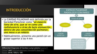 1) El documento describe diferentes tipos de lesiones cavitadas pulmonares, incluyendo infecciones como tuberculosis, abscesos pulmonares, émbolos sépticos y aspergilosis, así como enfermedades sistémicas como la granulomatosis con poliangeítis.