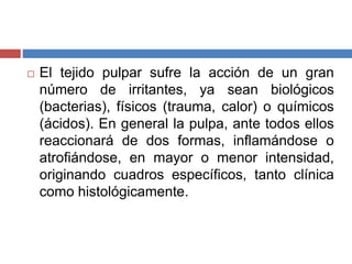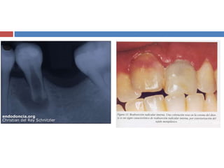1) El documento describe diferentes tipos de lesiones pulpares y periapicales, incluyendo calcificación pulpar, pulpolitosis, periodontitis apical aguda y crónica, y reabsorción interna.