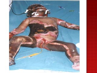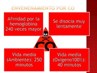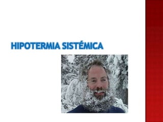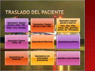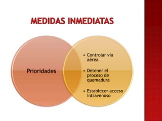 Este documento describe los signos y síntomas de lesiones por inhalación y quemaduras, así como las prioridades de tratamiento que incluyen controlar la vía aérea, detener el proceso de quemadura y establecer acceso intravenoso. También proporciona información sobre la valoración de áreas quemadas, profundidad de quemaduras, líquidos para infundir, pruebas recomendadas y tratamiento para hipotermia.