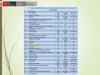 Este documento trata sobre lesionología forense. Define lesiones desde los puntos de vista médico y jurídico, y clasifica lesiones según su gravedad, intencionalidad, agente causante y etiología médico-legal. También describe diferentes tipos de lesiones como contusiones, heridas por arma blanca y de fuego, quemaduras y heladuras. El documento provee información relevante para la valoración forense de daños corporales.