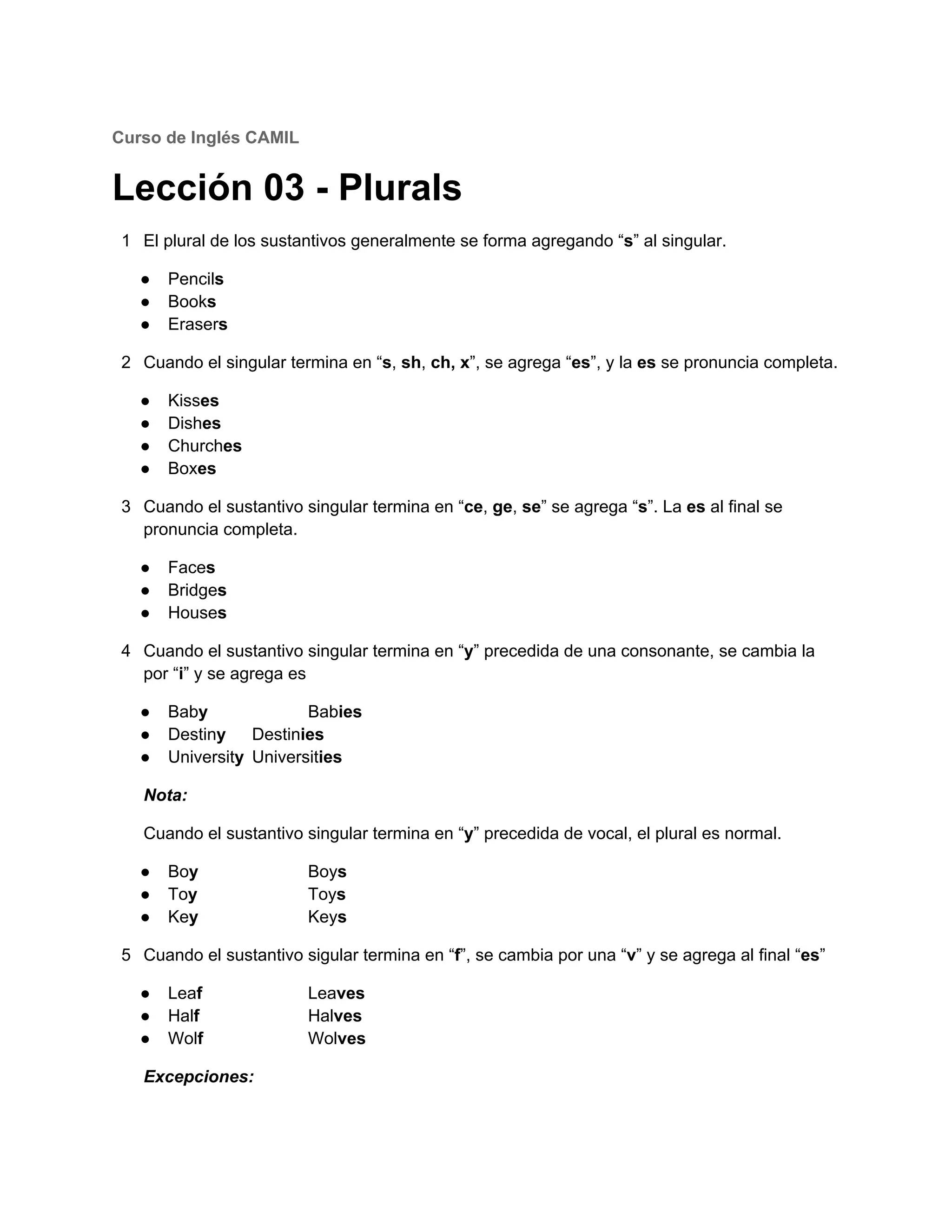El documento describe las reglas para formar el plural de sustantivos en inglés. Generalmente se agrega "s", pero hay excepciones para palabras que terminan en ciertas letras como "s", "x", "y", "f", "fe", u "o". Algunas palabras tienen plurales irregulares como "man"/"men" y "child"/"children".
