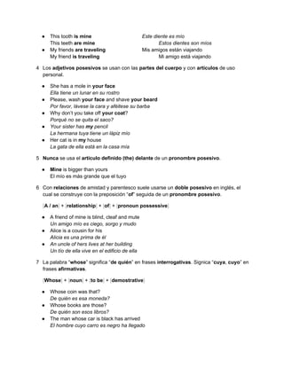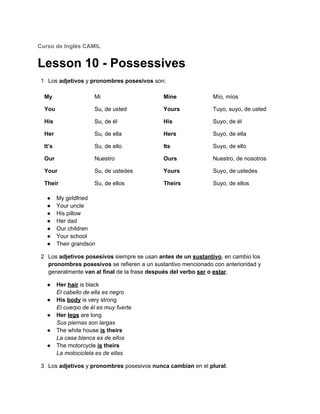 El documento proporciona una lección sobre los posesivos en inglés. Explica los adjetivos y pronombres posesivos en inglés y cómo se usan antes o después de un sustantivo. También cubre el uso de dobles posesivos con relaciones, y la palabra "whose" para preguntas.
