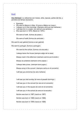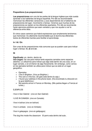 Este documento habla sobre las preposiciones más comunes en inglés y sus usos. Explica las diferencias entre preposiciones de lugar como "in", "at" y "on" y cómo se usan para indicar ubicaciones. También cubre preposiciones como "next to", "by", "between", "behind", "in front of" y "opposite" y cómo indican la posición relativa de objetos y personas. El documento incluye muchos ejemplos para ilustrar los diferentes usos de cada preposición.